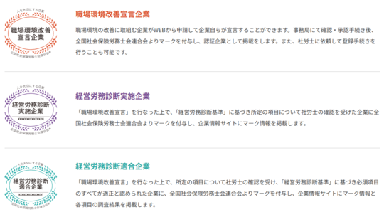 認定マークには3種類あり(次の項目で解説します)、社会保険労務士に依頼することで(一部は企業で実施可能)認定マークを獲得することができます。